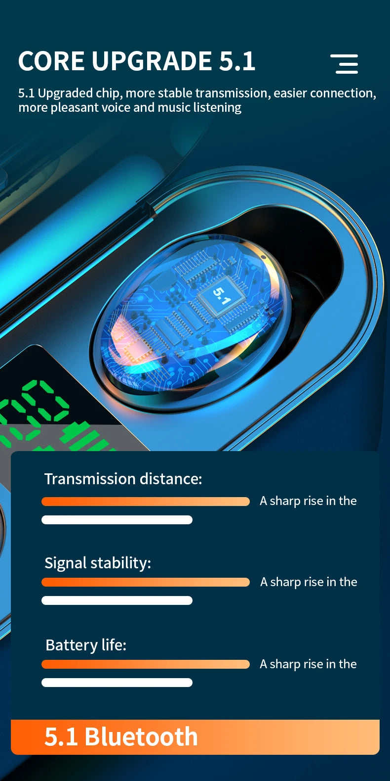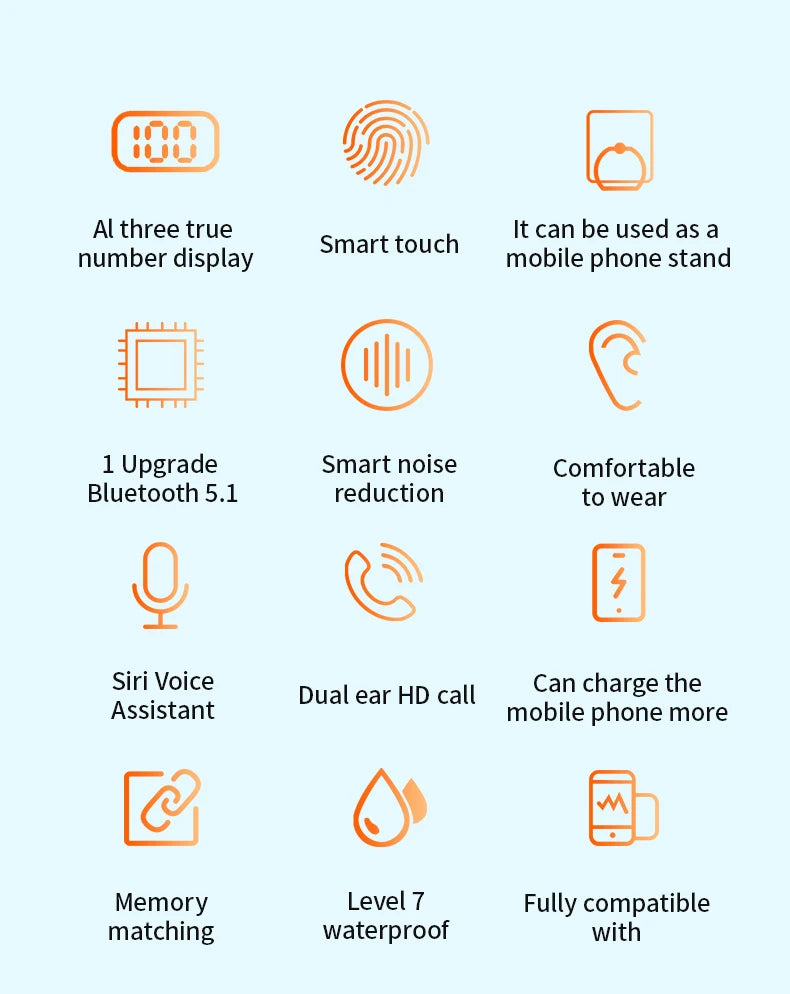 La technologie Bluetooth 5.0 offre une connectivité plus stable et une consommation d'énergie réduite. Prend en charge les appels en double stéréo. Dès les écouteurs complètement chargés, profitez de 4 à 5 heures de musique ou d'appels. Placez les écouteurs dans l'étui pour une recharge automatique.