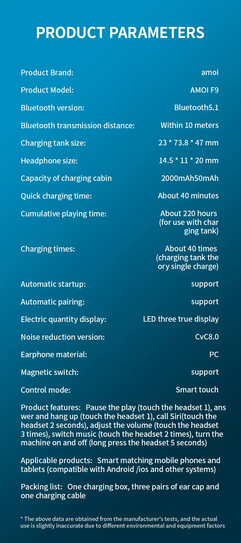 Très bonne qualité sonore et technologie Bluetooth 5.0 avancée offrant une qualité de son exceptionnelle. Transmission plus rapide et connexion plus stable jusqu'à 10 mètres. La réduction de bruit CVC 6.0 permet une transmission vocale claire, et diminue le bruit de fond, tout en offrant une expérience d'écoute unique.